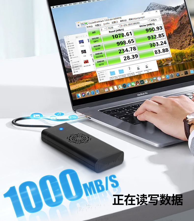 10/20Gbps高速傳輸鋁合金外殼,非一般速度1GB文件實現(xiàn)秒傳,采用主控芯片RTL9210B,理論傳輸速度10Gbps實測讀取和寫入速度可達(dá)1000MB/S左右,鋁合金外殼+內(nèi)置風(fēng)扇雙層散熱,利于數(shù)據(jù)高速傳輸和存儲安全的同時,更好的延長SSD壽命。