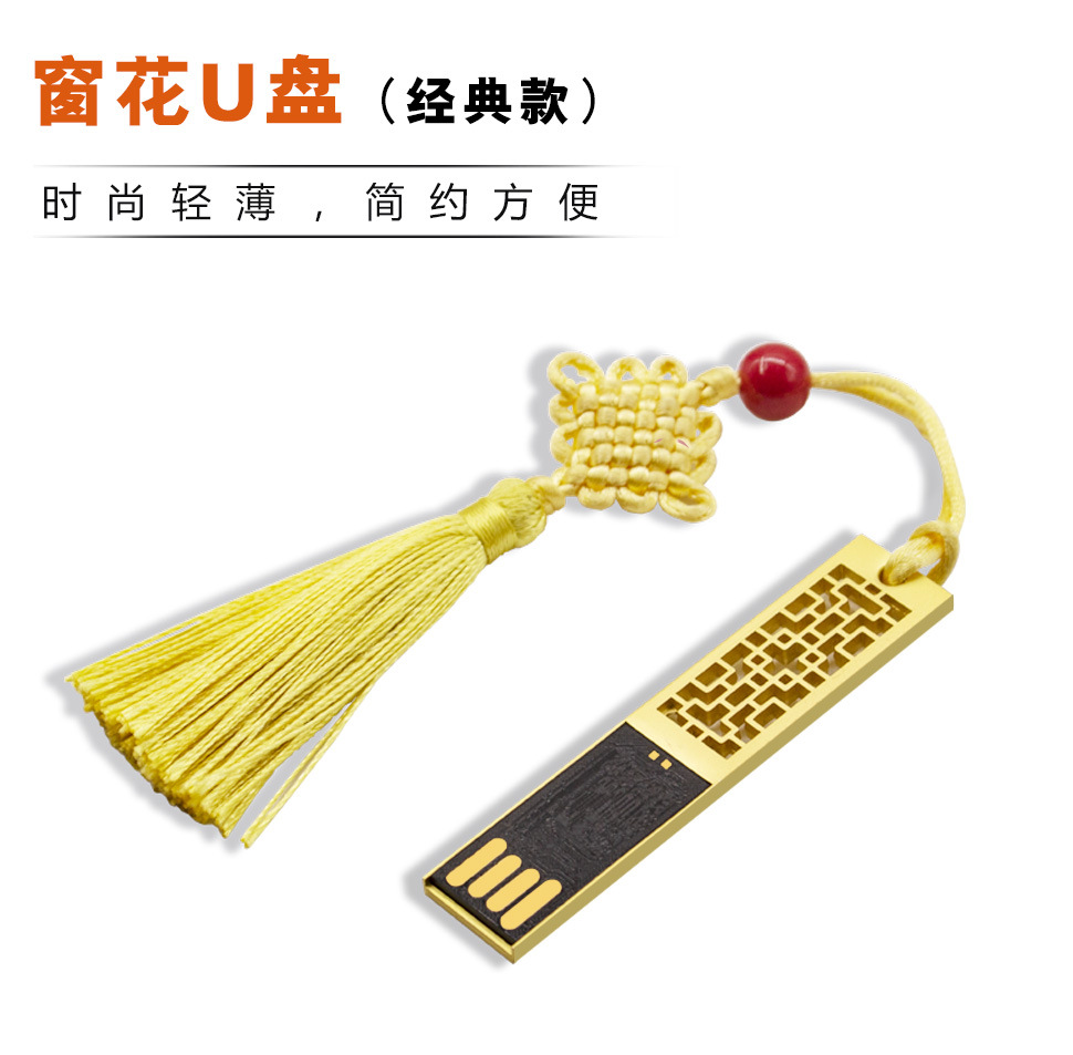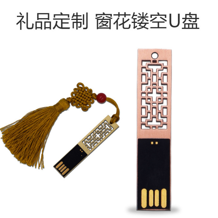 金屬窗花U盤是古典U盤系列的經典款式,一共有金色,銀色,古銅色三個顏色選擇,外殼已經做過拉絲效果處理,可以激光logo,也可以絲印logo。