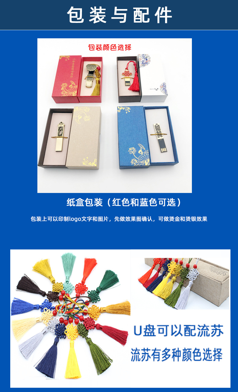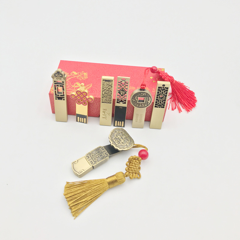 創意中國風U盤是我們出貨量比較大的款式,其中有如意,窗花,錢幣,中國結等多種花紋和圖案,古風優盤還可以訂制LOGO彩盒包裝。