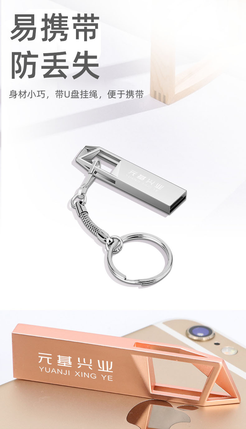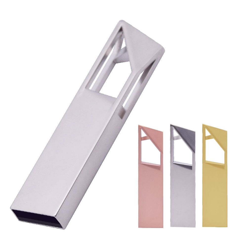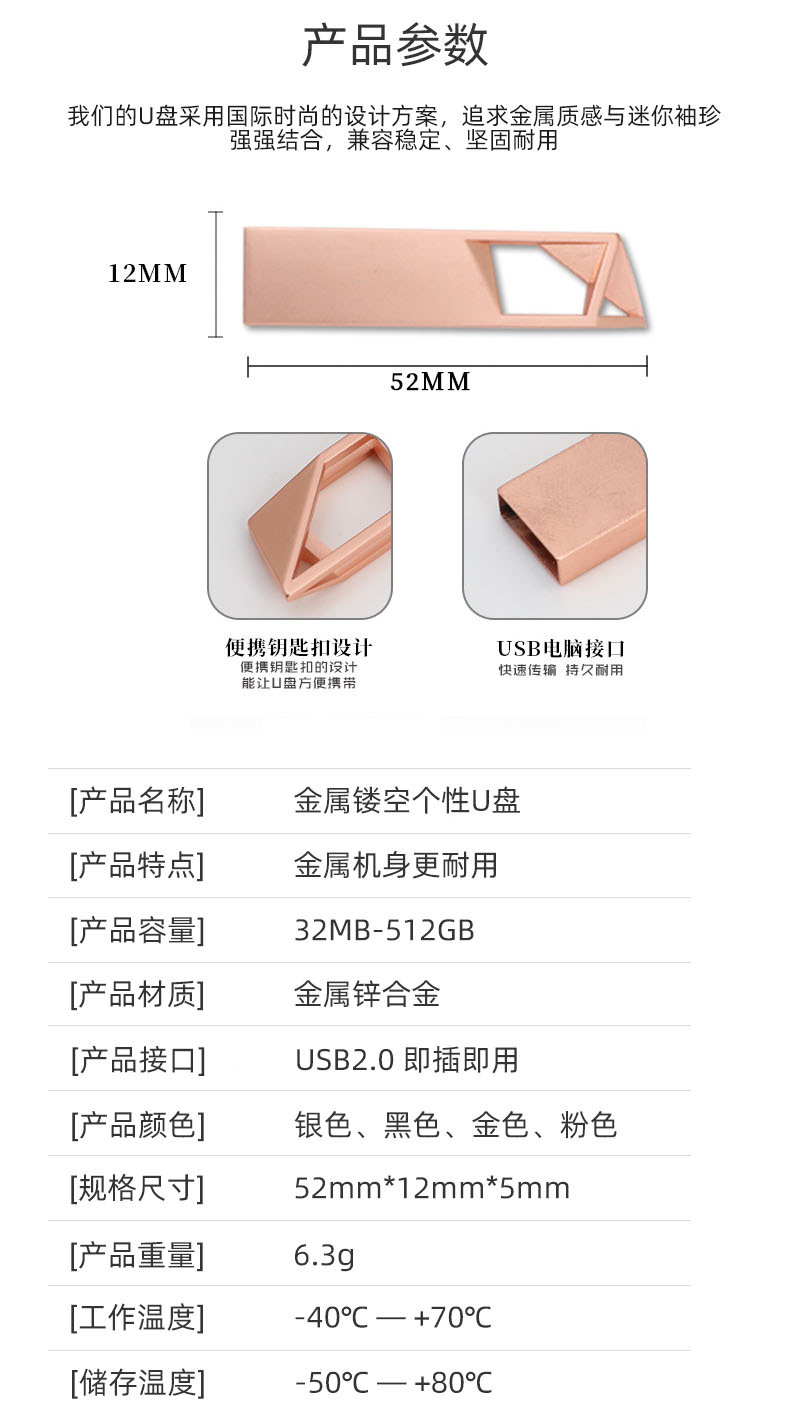 金屬鏤空U盤有兩種款式,一種是直接拔蓋的,這款就是金屬一體型,整體厚度只有2mm,屬于超薄款,頭部是鏤空設計,這款非常質感。
